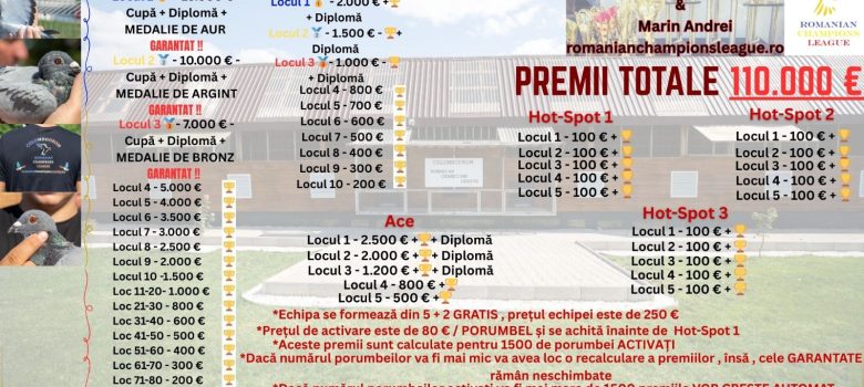 Primele 3 premii sunt Garantate ! ! ! ! ! Grila Premiere 2026 Columbodrom Romanian Champions LeagueContact Proprietar : Marin Virgil & Marin Andrei 0727104612 🏆👬 Marin Virgil & Andrei , va asteptam sa participati in sezonul 2026 ! ! ! -Capacitate Columbodrom 4000 locuri (posibilitate extindere)-Camere Live Online-Hrana de…